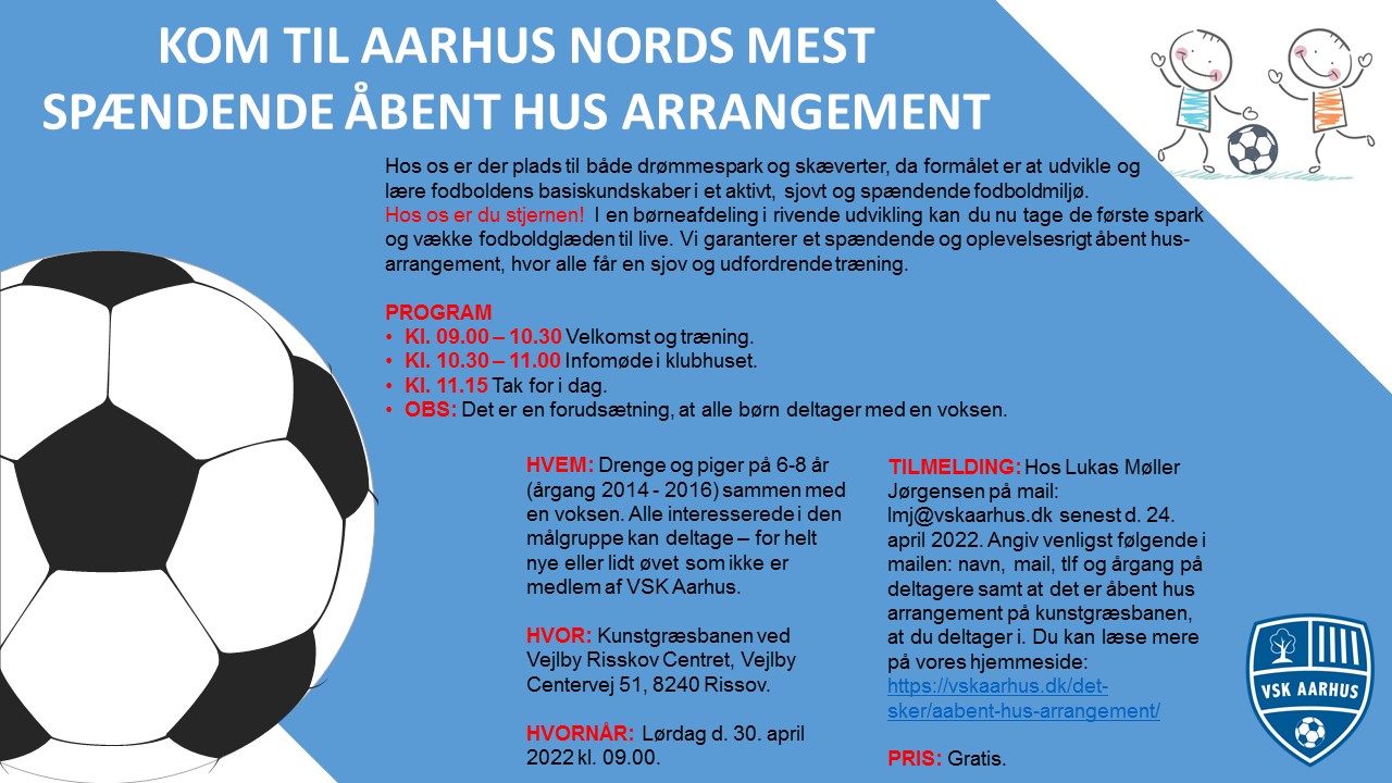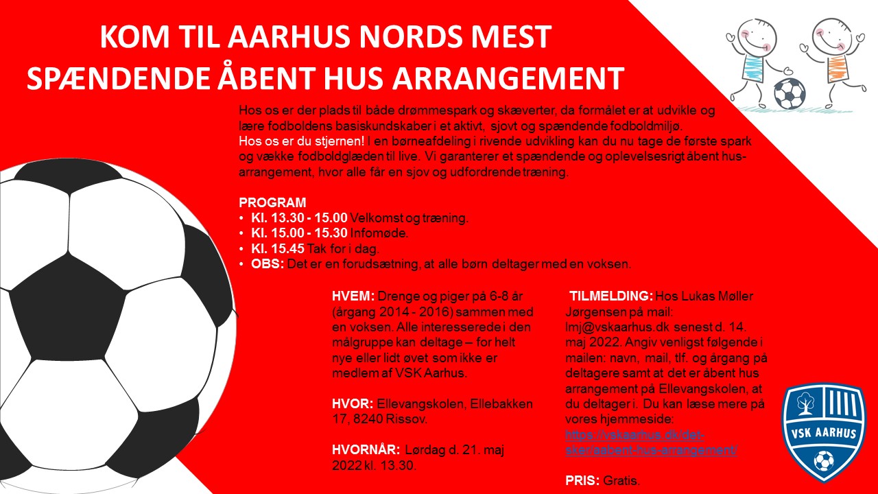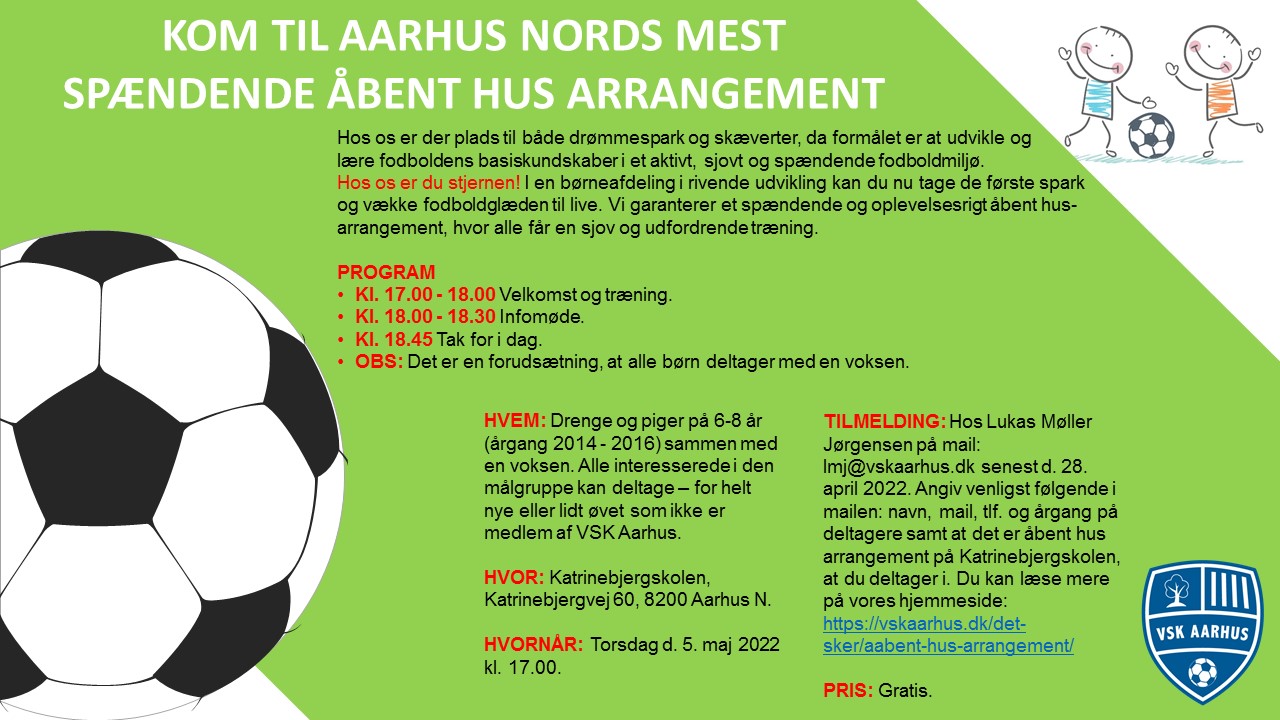 VSK Aarhus holder tre åbent hus arrangementer på henholdsvis Kunstgræsbanen, Katrinebjergskolen og Ellevangskolen for drenge og piger på 6-8 år (årgang 2014 - 2016) sammen med en voksen. Alle interesserede i den målgruppe kan deltage – for helt nye eller lidt øvet som ikke er medlem af VSK Aarhus.