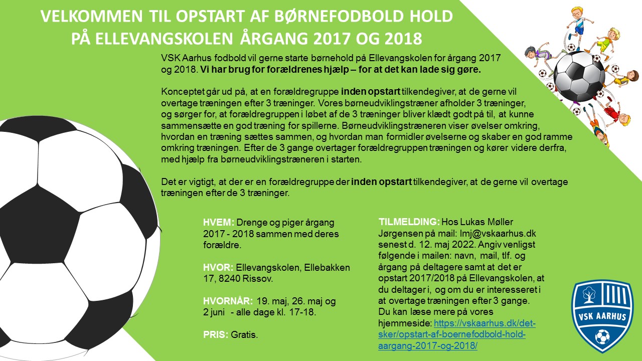VSK Aarhus fodbold vil gerne starte børnehold på Katrinebjergkolen og Ellevangskolen for årgang 2017 og 2018. Vi har brug for forældrenes hjælp – for at det kan lade sig gøre.